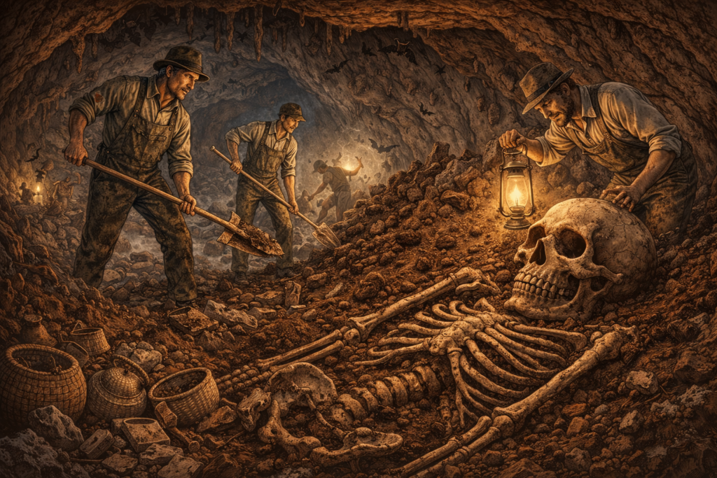 A principios del siglo XX, trabajadores que extraían guano de murciélago —utilizado como fertilizante— comenzaron a descubrir objetos antiguos: cestas finamente tejidas, herramientas, restos de animales… y, según algunos informes, huesos humanos de tamaño inusual.